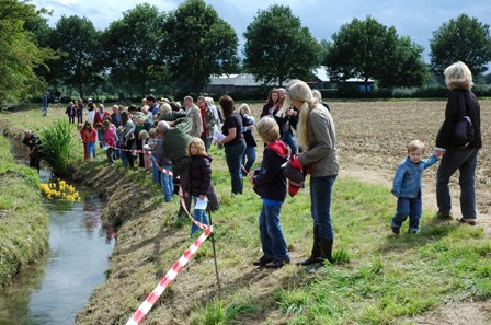 Am Nachmittag des 23. Juli 2011 fand auf der Niers das 1. Quietscheentchenwettrennen Wanlos statt. Die Jungschützen der St. Antonius-Sebastianus Bruderschaft Wanlo 1400 e.V. hatten zu diesem außergewöhnlichen Spektakel geladen. Bei wechselnd bewölktem Wetter ohne Regen kamen schließlich über 150 Besucher (darunter viele Familien) an die Niersbrücke beim Geflügelhof Dahmen und nahmen an dieser ungewöhnlichen Veranstaltung der Bruderschaft teil. Absolutes Highlight waren dabei die vier Quietscheentchen-Rennwettbewerbe, bei denen Teilnehmer verschiedener Altersklassen für 1,50€ ein nummeriertes Entchen erwerben konnten, das sich dann gegen Dutzende anderer gelber Enten durchzusetzen hatte. Teilweise kämpften über 100 Enten gleichzeitig um den Sieg. Thomas Irrgang, Erster Geschäftsführer der Bruderschaft, überwachte mit Gummistiefeln und Rechen ausgestattet als Schiedsrichter den Ablauf der Wettbewerbe – die DLRG passte auf, dass niemand ins Wasser fiel. Die Entchen wurden nämlich auf ihrer etwa 200 Meter langen und 12-minütigen Reise von ent(e)husiastischen Erwachsenen und Kindern begleitet, die ihre Enten lautstark anfeuerten. Die Bedingungen auf der Niers waren für die kleinen Plastikentchen allerdings recht anspruchsvoll: Natürliche Hindernisse wie Gräser und Schlick sowie ein Wasserfall wirbelten das Entenrudel immer wieder durcheinander und sorgten für viele Führungswechsel mit Hochspannung bei jedem Rennen. So mussten die Gewinner teilweise durch einen Fotobeweis herausgefunden werden. Alle Teilnehmer der Rennen konnten sich jeweils im Anschluss aus einem riesigen Angebot von Preisen, die gesponsert worden waren, ihr persönliches Andenken an das Quietscheentchenwettrennen mitnehmen. Die besten fünf Enten jedes Rennes (bzw. ihre „Besitzer“) wurden mit Urkunde, Quietscheente und tollen Preisen belohnt. So konnten sich insbesondere die vielen Kinder allesamt als Gewinner fühlen und verließen mit vollgestopften Taschen erst nach vielen Stunden das Niersufer. Alle Besucher erfreuten sich darüber hinaus an den vielen Angeboten zur Kinderanimation, kostenloser Verpflegung und der lustigen Moderation des Ersten Kassierers Michael Schmitz. Ausgangspunkt dieser Veranstaltung war eine Idee, die während des Jungschützentages im letzten Jahr an Jugendwart Stefan Stepprath herangetragen worden war. Dieser war von der Idee so begeistert, dass er sie unbedingt umsetzen wollte. Mithilfe der Gruppe der Jungschützen, die aus über 15 Jungen und Mädchen besteht und dieses Jahr beim Schützenfest Premiere feierte, und vieler anderer Helfer gelang es, nach wochenlanger Vorbereitungsarbeit dieses Event durchzuführen. Stepprath (verkleidet als Wanlos größte Quietscheente) sparte im Anschluss an das letzte Rennen entsprechend nicht mit Dank und verteilte Rosen an alle mitwirkenden Frauen. Durch eine famose Beteiligung der gesamten Bevölkerung, eine harmonische und fröhliche Stimmung und spannende Quietschenentenrennen mit begeisterten Teilnehmern in allen Altersklassen konnte im Nachhinein von einem vollen Erfolg gesprochen werden. Mal wieder bewahrheitete sich die alte Weisheit: Ente gut, alles gut.
