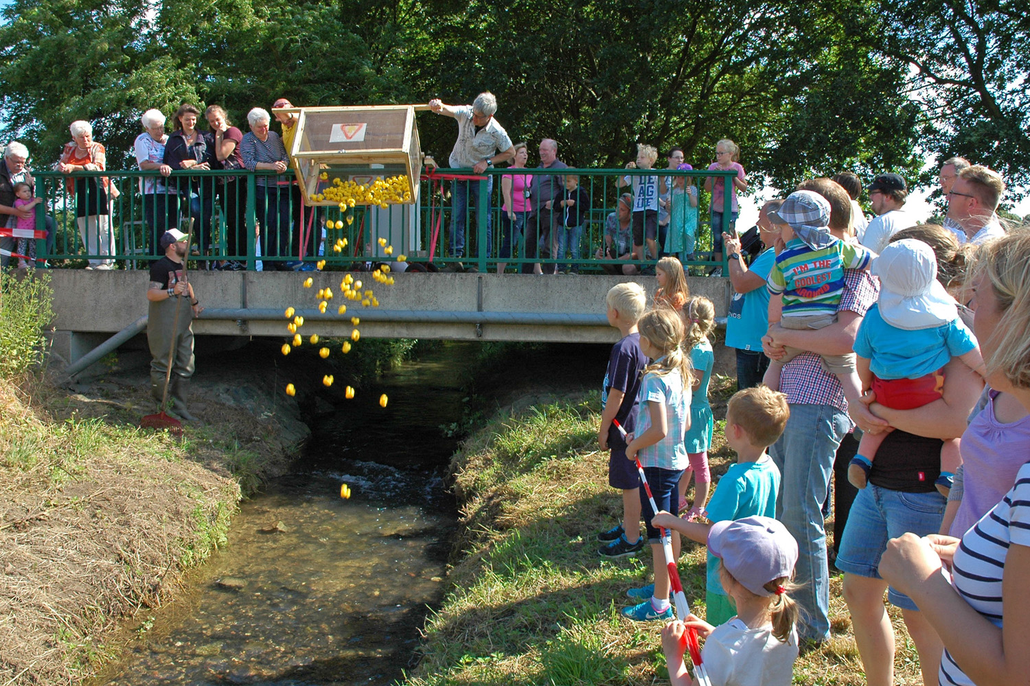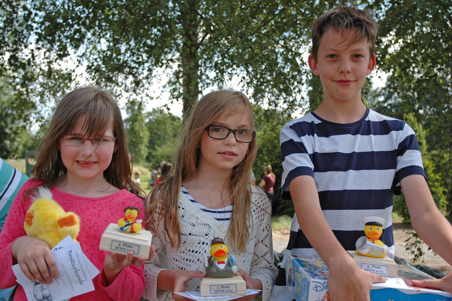 Das 5. Quietscheentchenwettrennen am 27. Juni 2015 war wieder ein großes Sommerfest, bei dem sich über 200 Besucher - groß und klein - vergnügen konnten. Bei sonnigem und trockenem Wetter genossen alle Gäste die fünf spannenden Rennen sowie das vielfältige Angebot, das die Bruderschaft für die Erwachsenen und Kinder bereit gestellt hatte. Natürlich gab es nach den Rennen wieder eine feierliche Siegerehrung und eine Menge Trostpreise für alle Kinder, die mit ihren Rennenten teilgenommen hatten. Während sich die Kinder an den Kübelspritzen, der Torwand, dem Tischkicker oder der Tischtennisplatte vergnügten, nahmen die Eltern und Verwandten das reichhaltige Angebot der Grill- und Kuchentheke wahr. Die Mädchen waren von der Möglichkeit begeistert, zusammen mit Raphaela Weber T-Shirts und Taschen mit Lederverzierungen und Nieten zu verschönern. Am Abend unterhielt die "Thomas Mentsches Band" die Besucher noch mit einem etwa zweistündigen musikalischen Leckerbissen.