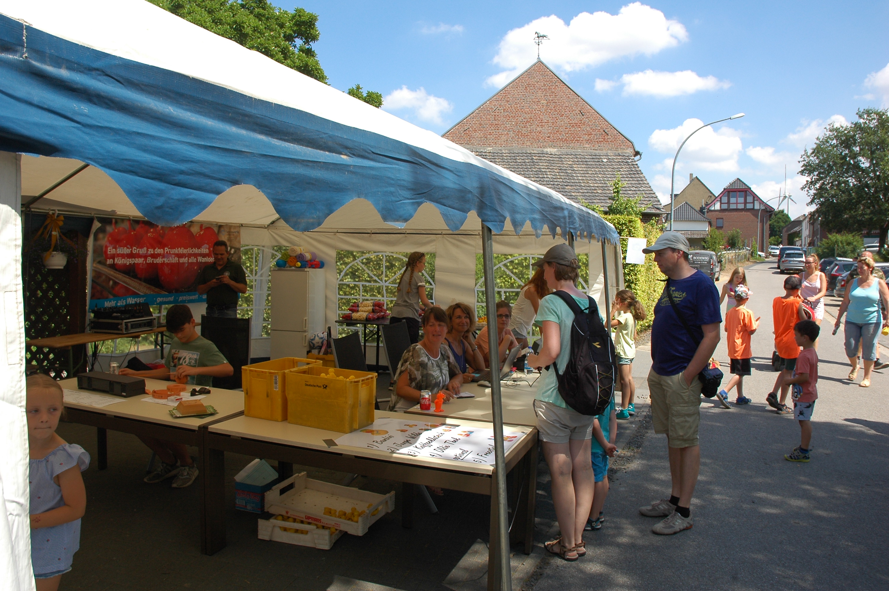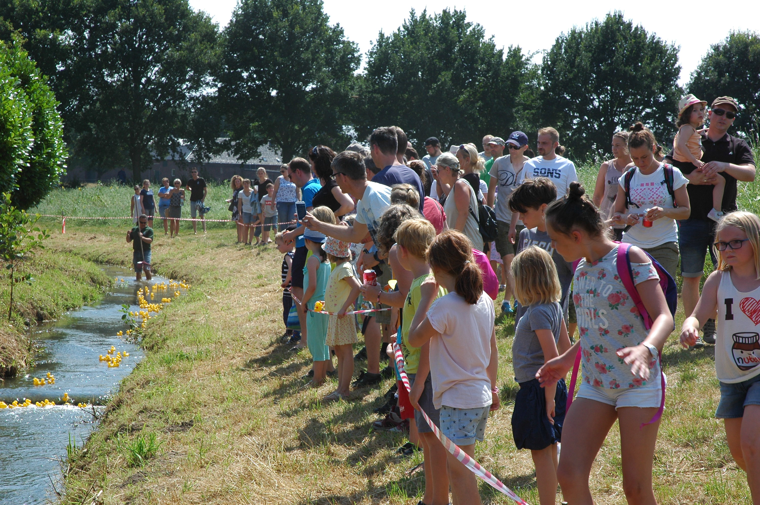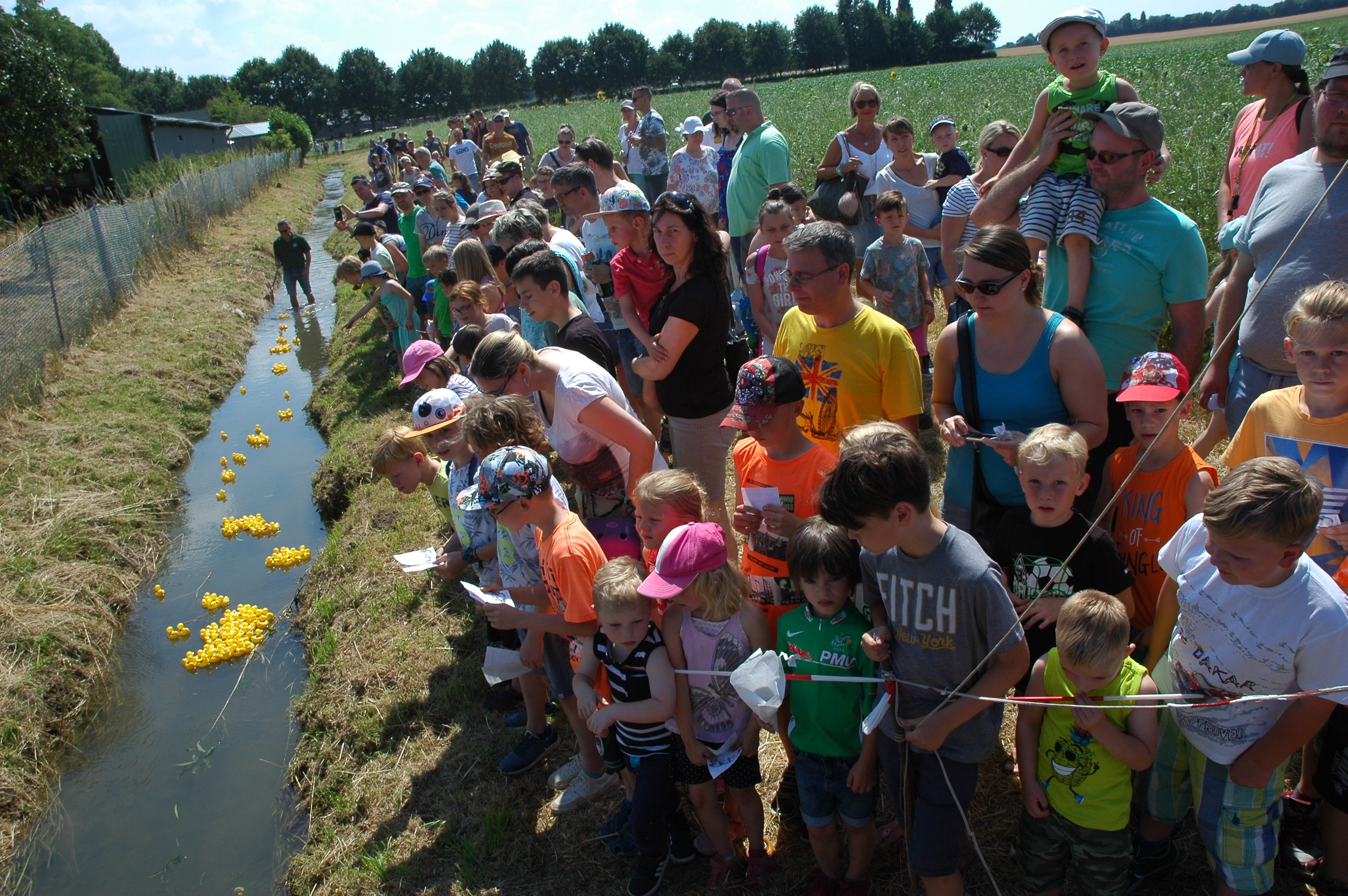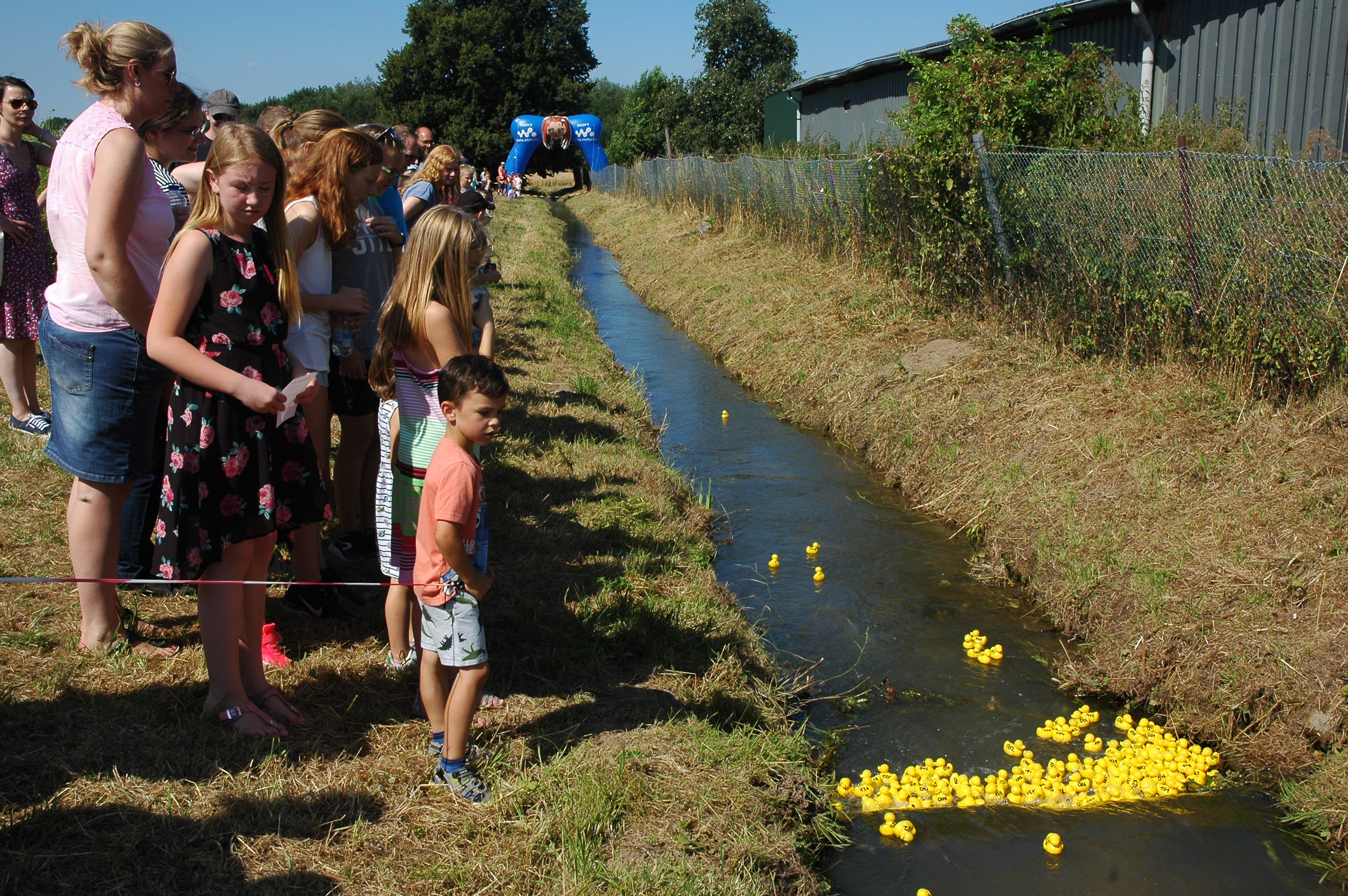 Den Auftakt machte die Bruderschaft Wanlo am ersten Samstag der Sommerferien mit der inzwischen achten Auflage des Quietscheentchenwettrennens auf der Niers. An die 200 Besucher kamen bei bestem Sommerwetter zur Niersbrücke und erlebten wieder einige spektakuläre Rennen. Vor allem für die Kinder war dieses Event wieder besonders spannend, erstmals konnten sie auch mit selbst gestalteten Enten an einem Rennen teilnehmen. Eine Hüpfburg, eine Torwand und Gratis-Eis rundeten das Entenrennen wieder erfolgreich ab.