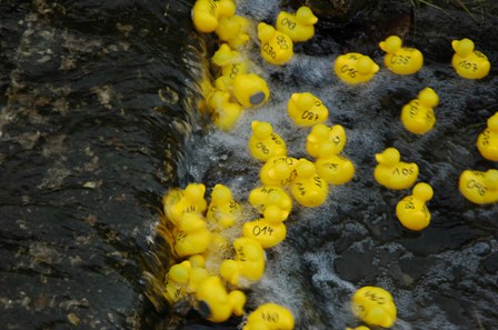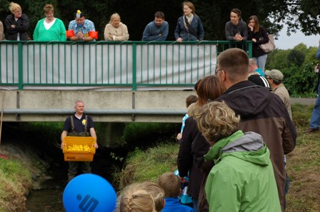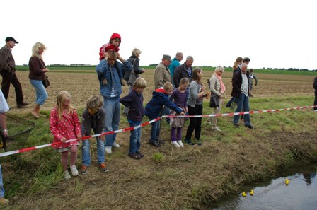 Am Nachmittag des 23. Juli 2011 fand auf der Niers das 1. Quietscheentchenwettrennen Wanlos statt. Die Jungschützen der St. Antonius-Sebastianus Bruderschaft Wanlo 1400 e.V. hatten zu diesem außergewöhnlichen Spektakel geladen. Bei wechselnd bewölktem Wetter ohne Regen kamen schließlich über 150 Besucher (darunter viele Familien) an die Niersbrücke beim Geflügelhof Dahmen und nahmen an dieser ungewöhnlichen Veranstaltung der Bruderschaft teil. Absolutes Highlight waren dabei die vier Quietscheentchen-Rennwettbewerbe, bei denen Teilnehmer verschiedener Altersklassen für 1,50€ ein nummeriertes Entchen erwerben konnten, das sich dann gegen Dutzende anderer gelber Enten durchzusetzen hatte. Teilweise kämpften über 100 Enten gleichzeitig um den Sieg. Thomas Irrgang, Erster Geschäftsführer der Bruderschaft, überwachte mit Gummistiefeln und Rechen ausgestattet als Schiedsrichter den Ablauf der Wettbewerbe – die DLRG passte auf, dass niemand ins Wasser fiel. Die Entchen wurden nämlich auf ihrer etwa 200 Meter langen und 12-minütigen Reise von ent(e)husiastischen Erwachsenen und Kindern begleitet, die ihre Enten lautstark anfeuerten. Die Bedingungen auf der Niers waren für die kleinen Plastikentchen allerdings recht anspruchsvoll: Natürliche Hindernisse wie Gräser und Schlick sowie ein Wasserfall wirbelten das Entenrudel immer wieder durcheinander und sorgten für viele Führungswechsel mit Hochspannung bei jedem Rennen. So mussten die Gewinner teilweise durch einen Fotobeweis herausgefunden werden. Alle Teilnehmer der Rennen konnten sich jeweils im Anschluss aus einem riesigen Angebot von Preisen, die gesponsert worden waren, ihr persönliches Andenken an das Quietscheentchenwettrennen mitnehmen. Die besten fünf Enten jedes Rennes (bzw. ihre „Besitzer“) wurden mit Urkunde, Quietscheente und tollen Preisen belohnt. So konnten sich insbesondere die vielen Kinder allesamt als Gewinner fühlen und verließen mit vollgestopften Taschen erst nach vielen Stunden das Niersufer. Alle Besucher erfreuten sich darüber hinaus an den vielen Angeboten zur Kinderanimation, kostenloser Verpflegung und der lustigen Moderation des Ersten Kassierers Michael Schmitz. Ausgangspunkt dieser Veranstaltung war eine Idee, die während des Jungschützentages im letzten Jahr an Jugendwart Stefan Stepprath herangetragen worden war. Dieser war von der Idee so begeistert, dass er sie unbedingt umsetzen wollte. Mithilfe der Gruppe der Jungschützen, die aus über 15 Jungen und Mädchen besteht und dieses Jahr beim Schützenfest Premiere feierte, und vieler anderer Helfer gelang es, nach wochenlanger Vorbereitungsarbeit dieses Event durchzuführen. Stepprath (verkleidet als Wanlos größte Quietscheente) sparte im Anschluss an das letzte Rennen entsprechend nicht mit Dank und verteilte Rosen an alle mitwirkenden Frauen. Durch eine famose Beteiligung der gesamten Bevölkerung, eine harmonische und fröhliche Stimmung und spannende Quietschenentenrennen mit begeisterten Teilnehmern in allen Altersklassen konnte im Nachhinein von einem vollen Erfolg gesprochen werden. Mal wieder bewahrheitete sich die alte Weisheit: Ente gut, alles gut.